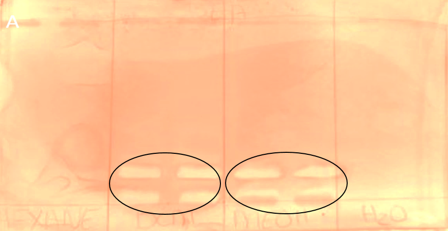 Fig. 5: TLC bioautography antibacterial activity analysis showing growth inhibition against Streptococcus pyogenes from the DCM and the MeOH root extracts of Asparagus suaveolens. (circled area shows clear zones on the chromatogram that depict growth inhibition of the bacterial strains by compound(s) within the extract)