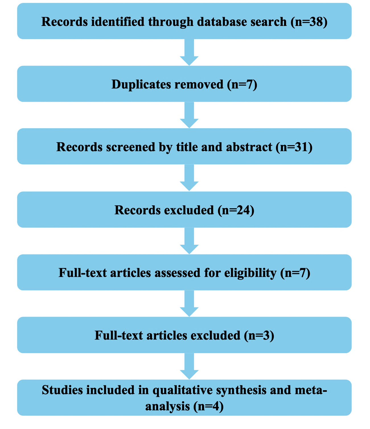 A total of 38 records were retrieved through systematic searches of electronic databases. Following the removal of 7 duplicate entries, 31 unique records were subjected to title and abstract screening. Of these, 24 studies were excluded for not meeting the predefined inclusion criteria based on their titles and abstracts. The remaining 7 articles were reviewed in full text for eligibility. After applying the inclusion and exclusion criteria, 3 full-text articles were excluded due to insufficient outcome data or non-randomized design. Consequently, 4 randomized controlled trials metal eligibility requirements and were included in both the qualitative synthesis and quantitative meta-analysis. The full study selection process is illustrated in table 1 and fig. 1, structured according to the PRISMA 2020 guidelines [18].