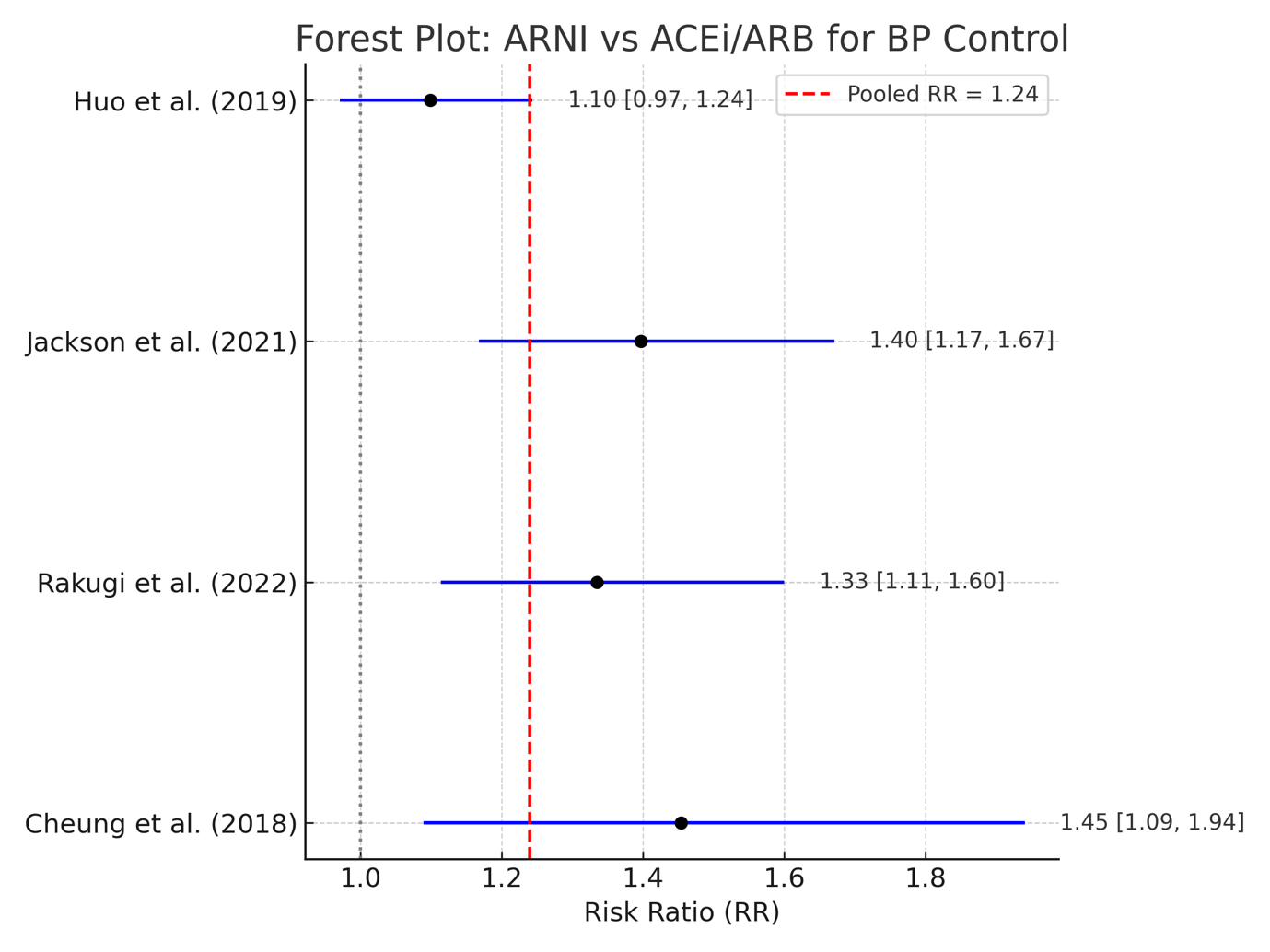 Conclusion: Sacubitril/valsartan improves the likelihood of achieving target blood pressure levels compared to ACEIs or ARBs in adults with hypertension. These findings support the potential of angiotensin receptor-neprilysin inhibitors (ARNIs) as a more effective therapeutic option in contemporary hypertension management.