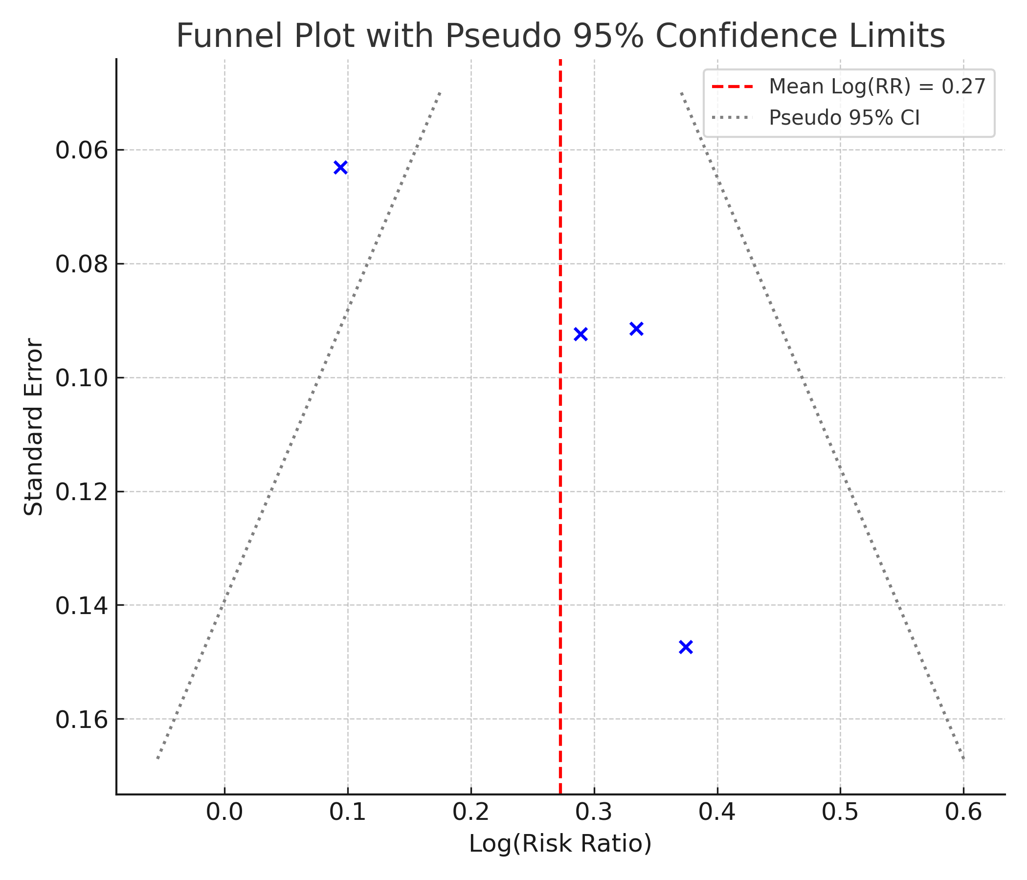 A leave-one-out sensitivity analysis was conducted to examine the robustness of the pooled effect size and heterogeneity by sequentially removing each individual study from the meta-analysis. The analysis revealed that the overall pooled log risk ratio (Log[RR]) remained relatively stable, ranging from 0.18 to 0.32, indicating that no single study disproportionately influenced the overall effect estimate. In terms of heterogeneity, the Cochran’s Q statistic varied modestly between 4.98 and 6.59, while the I² statistic fluctuated between 59.9% and 69.7%, suggesting moderate to substantial heterogeneity persisted even after the exclusion of individual studies. The highest I² value was observed when S1 was removed, while the lowest was recorded upon the exclusion of S2. However, no substantial reduction in heterogeneity occurred with the removal of any single study, indicating that heterogeneity is likely driven by cumulative differences across multiple trials rather than an outlier effect from any one study.