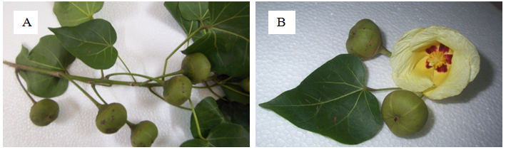 Fig. 1A: Leaves and fruit of Thespesia populnea, B: Leaf, flower and fruit of Thespesia populnea
