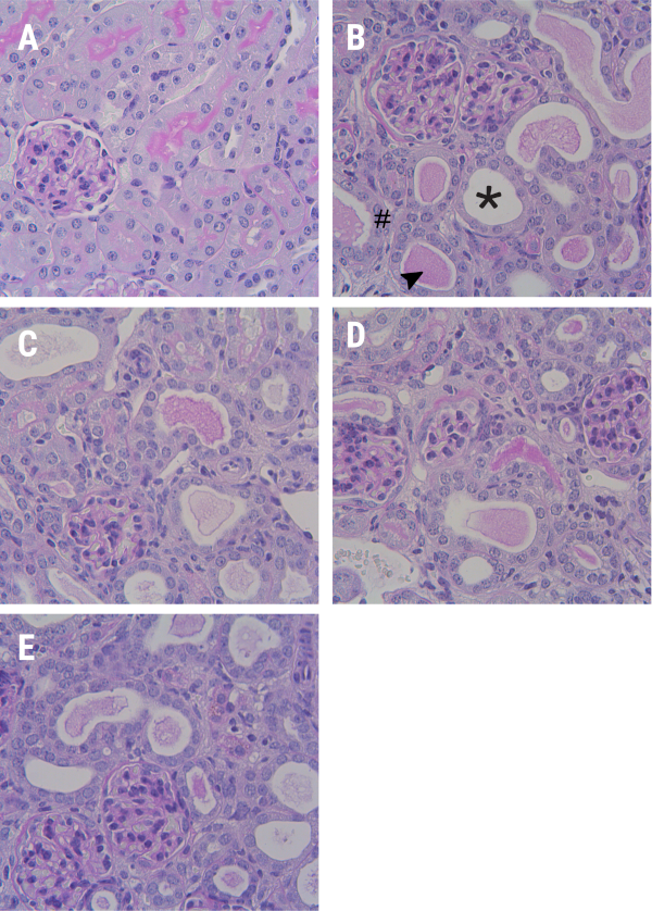 Fig. 1: Representative images of kidney sections (cortices) stained with Periodic acid–Schiff (PAS) (A) Sham Control group, showing normal morphology; (B) UUO Control group, showing tubular dilation (* asterisk), atrophy (# hash), and intratubular cast formation (arrowheads, ). (C-E) SFSE-G (30, 60, and 100 mg/kg)-treated groups showed less damage. UUO, Unilateral Ureteral Obstruction, Stain: PAS, Magnification: 400X