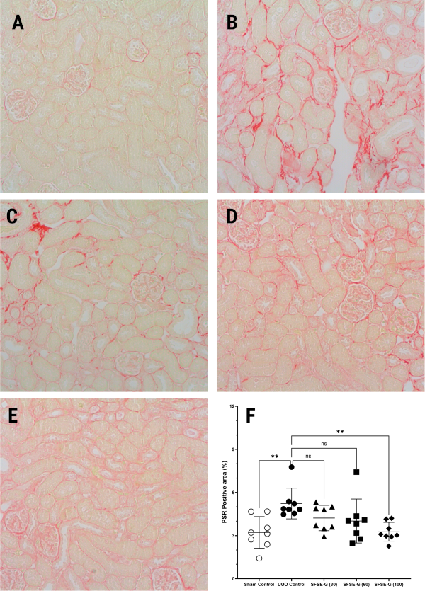 Representative photomicrographs of kidney sections stained with PSR () demonstrated extensive collagen deposition (stained as intense red color) in the tubulointerstitial sections of kidneys from of UUO control (fig. 2B) (but not from Sham Control (fig. 2A), confirming the development of significant RIF. SFSE-G treatment resulted in dose-dependent protection, with visibly less collagen deposition (vs. UUO control), suggesting a fibrosis-preventive potential (fig. 2C to fig. 2E).