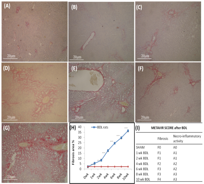 Fig. 2: Liver tissue sections from sham operated rats (A) and rats with BDL, on post-operative week 1 (B), week 2 (C), week 2 (D), week 6 (E), week 8 (F) and week 10 (G), stained with sirus red. Representative photographs of liver sections from three different animals at each time point, and three randomly selected areas from each section were analyzed. (H) Sirus red stained liver tissue sections from rats with sham operation, or with BDL at different time points after surgery (weeks 1, 2, 4, 6, 8 and 10) were measured using image J software and expressed as a percentage of total analyzed area (% fibrosis). Results are means±SD from 9 consecutive fields; ***P˂0.001 as compared to sham groups. Original magnification X 100. (I) Metavir scoring at different time point following BDL