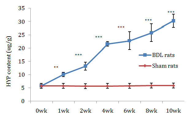 Fig. 3: Hydroxy proline (HYP) content in liver tissues of BDL-and sham-operated rats at different time durations after BDL. Results were expressed as mean±SD, n=3 and 6 for sham and BDL groups respectively. *P˂0.05, **P˂0.01, ***P˂0.001 as compared to sham groups