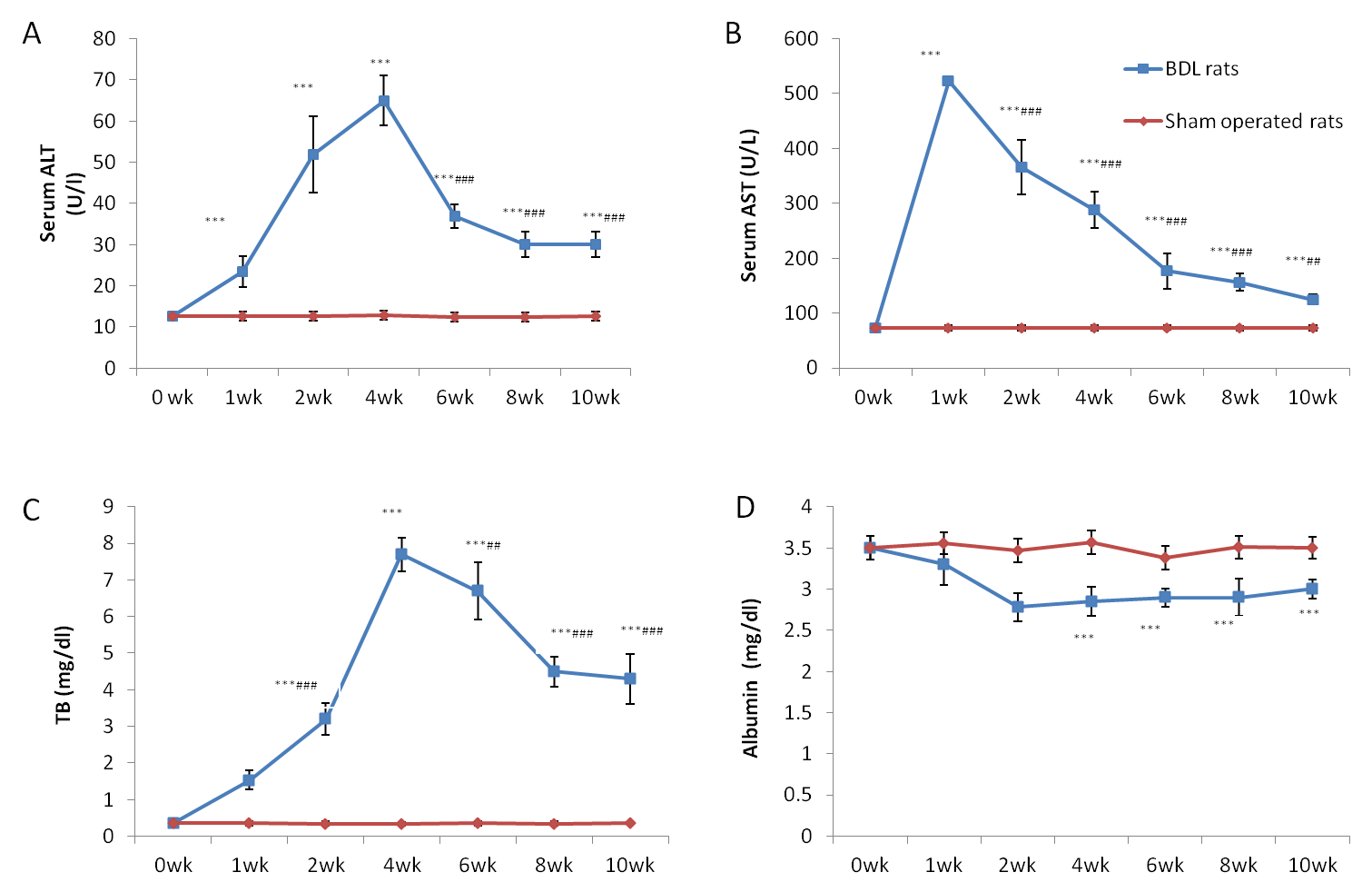 Fig. 4: Serum biochemical tests of cholestatic liver injury induced by BDL. Serum concentration of (A) ALT, (B) AST, (C) total bilirubin and (D) albumin were measured in BDL-rats and sham-operated rats at different time points up to 10 weeks following surgery. Results were expressed as mean±SD and n=3 and 6 for sham and BDL groups respectively. ***P˂0.001 as compared to sham groups and ###P˂0.001 as compared to peak value