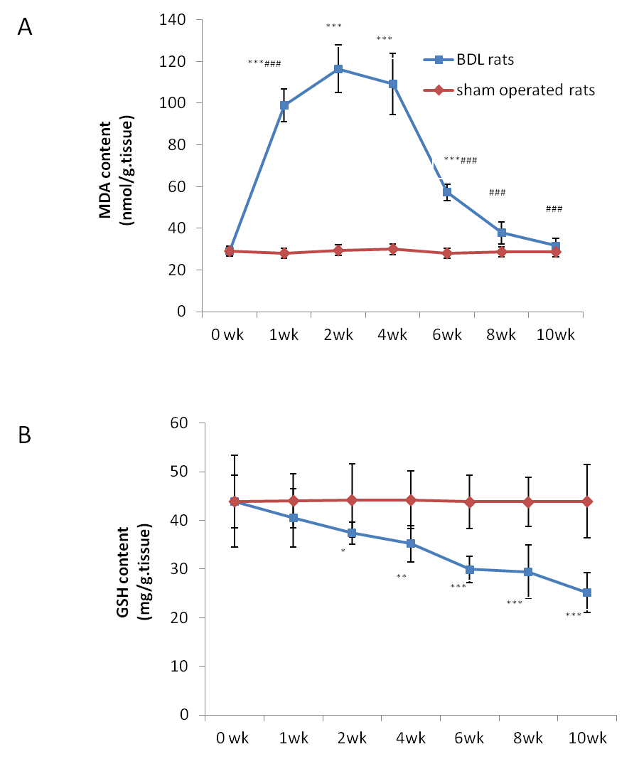 Fig. 5: Hepatic MDA (A) and GSH (B) content in BDL-and sham-operated rats at different time durations after BDL. Results were expressed as mean±SD, n=3 and 6 for sham and BDL groups, respectively. *P˂0.05, **P˂0.01, ***P˂0.001 as compared to sham groups and ###P˂0.001 as compared to peak value