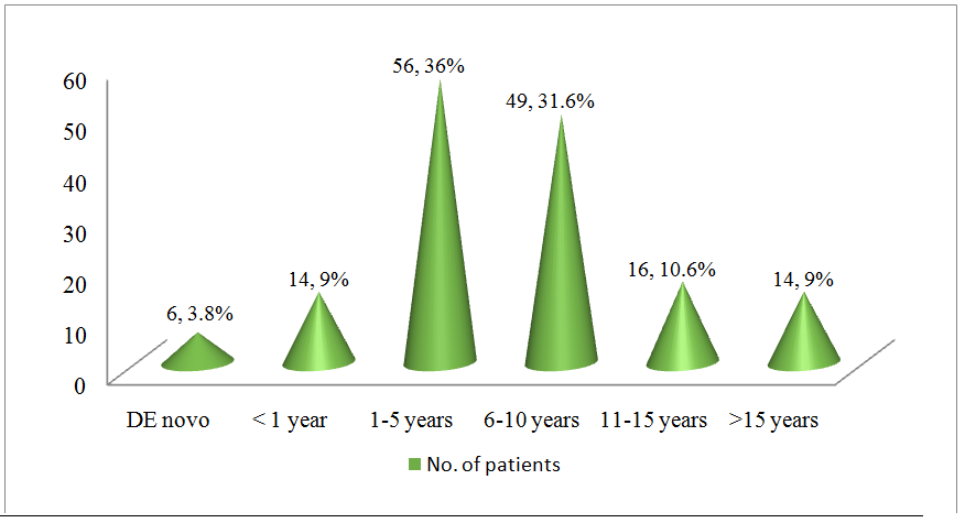 Onset of renal and cardiac complications was found to be 36% (n=56) in patients with 1-5 years of duration of diabetes, followed by 31.6% (n=49) in patients with 6-10 years of duration, then 10.6% (n=16) with 11-15 years of duration of diabetes. 71% (n=40) of the subjects in the duration of 1-5 years of diabetes were not on regular medication. Further detail on duration of diabetes for development of renal and cardiac complications is given in fig. 2.