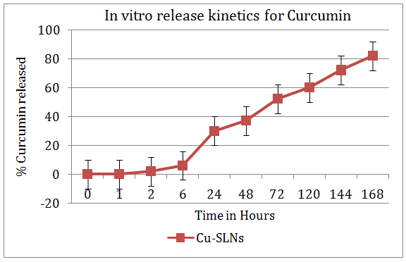 In vitro release kinetics studies for Curcumin loaded SLNs exhibited a sustained release pattern. Sustained release was observed over a period of 7 days. Initial burst release can be attributed to dissociation of surface absorbed Curcumin into lipid matrix while sustained released over a period of 7 days can be attributed to release of Curcumin from nanoparticles. Native Curcumin was visibly insoluble in PBS and after 7 days, only 6% drug releases were observed.