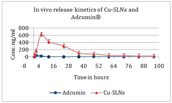 Fig. 3: In vivo release kinetics of Curcumin loaded SLNs and Adcumin®