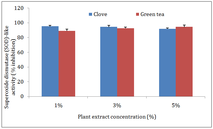 Fig. 1: Superoxide dismutase (SOD)-like activity (expressed as % inhibition) of green tea and clove extracts. Each bar represents the mean of three trails±SD
