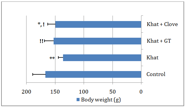 Fig. 2 shows that animals treated with khat extract showed a significant decrease (P<0.001) in body weight compared to the control. On the other hand, body weight of the animals treated with clove or green tea extract showed a significant improvement compared to khat group.