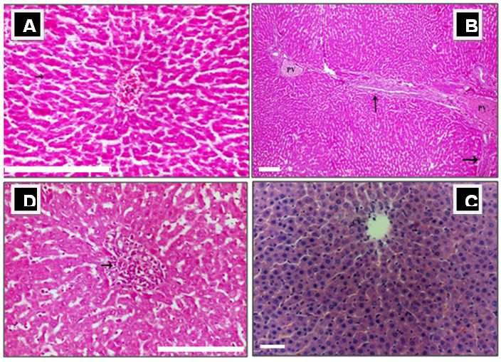 Fig. 3: Liver histopathology. (A) Section of control rat liver showing normal hepatocytes (arrow) with normal radial arrangements around central vein (CV) (H&E, x400) (Scale bar 100 µm). (B) Liver section of rat administered with khat extract showing congestion in portal vein (PV) with fibrous tissue proliferation, extended from portal area and forming intralobular Porto-portal bridging fibrous septae (arrow) (H&E, x100) (Scale bar 100 µm). (C) Liver section of rat administered with khat plus green tea extracts showing quite normal structure of central vein, sinusoid and portal tract (CV) (H&E, x100) (Scale bar 100 µm). (D) Liver section of rat administered with khat plus clove extracts showing lymphohistiocytic exudate (arrow) with normal hepatocytes (H&E, x400) (Scale bar 100 µm).