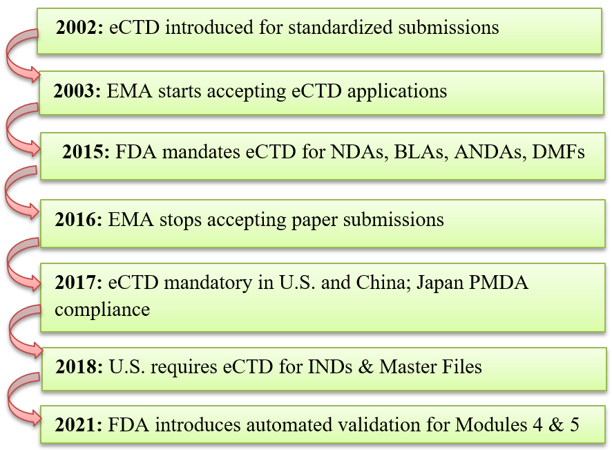 Key milestones in the evolution of electronic regulatory submissions, including the adoption of eCTD and transition from paper-based dossiers, synthesized from regulatory agency reports and published literature [1, 12, 13] (Created by authors)