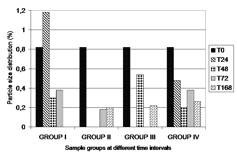 In Groups I and IV, a gradual reduction in the percentage of lipid particles>5 μm over time was also observed, reaching zero at 168 h for the samples of Group I stored at room-controlled temperature.