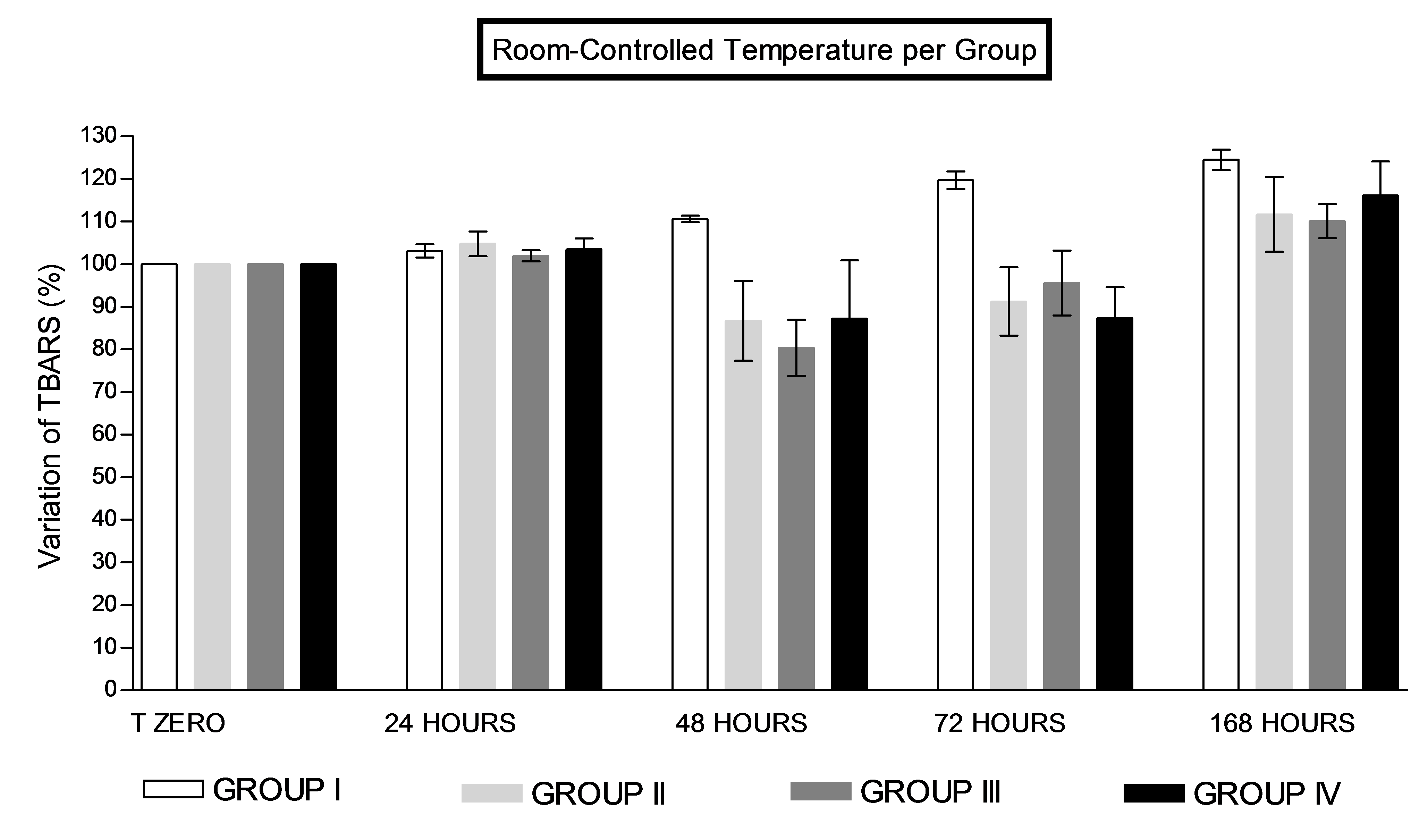 Fig. 3: Variation in percentage of TBARS (thiobarbituric acid reactive substances) in samples under room-controlled temperature (22 ° to 28 °C) Group I–control samples (bags without sterilization and without inoculation); Group II-bags sterilized by gamma irradiation; Group III-bags inoculated with microorganisms and then sterilized by gamma irradiation; Group IV-bags only inoculated