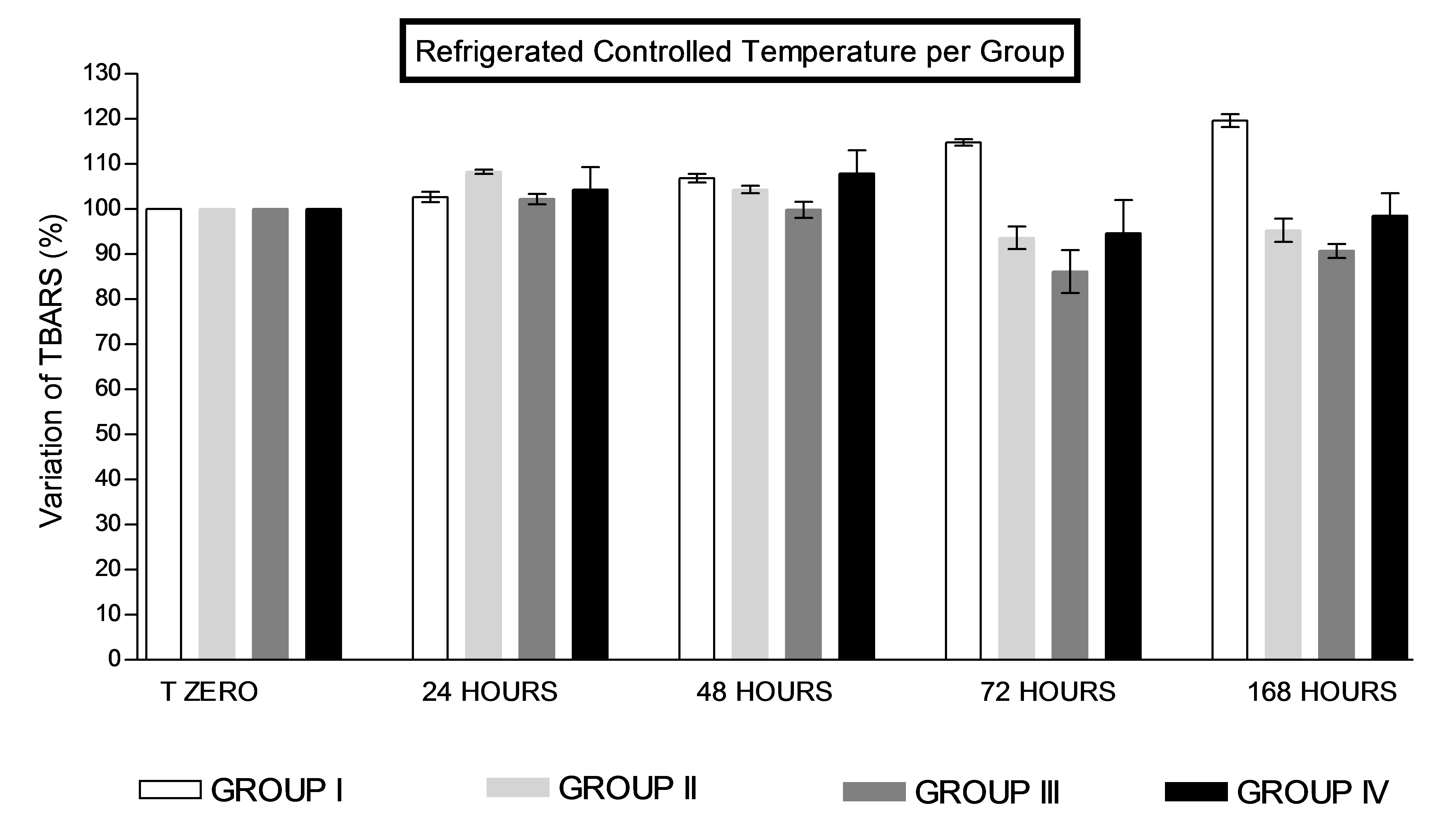 Fig. 4: Variation in percentage of TBARS (thiobarbituric acid reactive substances) in samples under refrigerated controlled temperature (2 ° to 8 °C) Group I–control samples (bags without sterilization and without inoculation); Group II-bags sterilized by gamma irradiation; Group III-bags inoculated with microorganisms and then sterilized by gamma irradiation; Group IV-bags only inoculated
