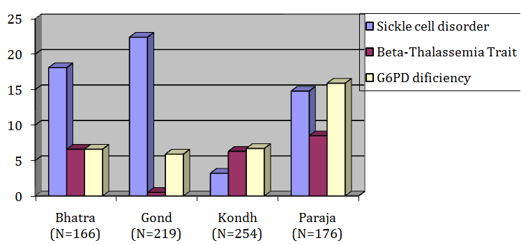 The prevalence of genetic diseases such as SCD, Beta-Thalassemia trait and G6PD deficiency in 815 screened populations was 3.2% to 22.5%, 0.5% to 8.5% and 6% to 16%, respectively, among the Bhatra, Gond, Kondh and Paraja tribes belonging to bordering districts of Chhattisgarh and Orissa.