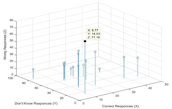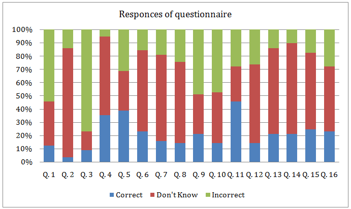 The resultant fig. 4, fig. 5 and fig. 6 are represent response rate of the questionnaire where output field refers to the presence and absence of awareness level about Thalassemia disease among the participants. Clearly, fig. 4 shows the responses of questionnaire on column chart, of the taking an interest families, 64.91% were females and 35.09% were male. The fig. 5 states to the frequencies of reactions were 20%, giving the right answers and 28%, giving wrong answers while half is not thinking about the given questionnaire. Also fig. 6 shows the frequencies of each questionnaire in one view and state about the responses of participants, this depicts the data given in table 2. For example, the value of correct response (X), Don't know response (Y) and Wrong response (Z) are 8.77, 14.03 and 77.19 respectively can be verified with S. N. 3 of table 2.