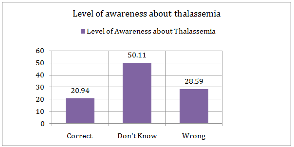 In our study, we have found that overall, 64.91% participants are females and 35.09% are males. Also, 20% of respondents felt comfortable with the questionnaire method of Thalassemia disease. The frequencies of responses were 20%, giving the right answers and 28%, giving wrong answers while half is not thinking about the given questionnaire.