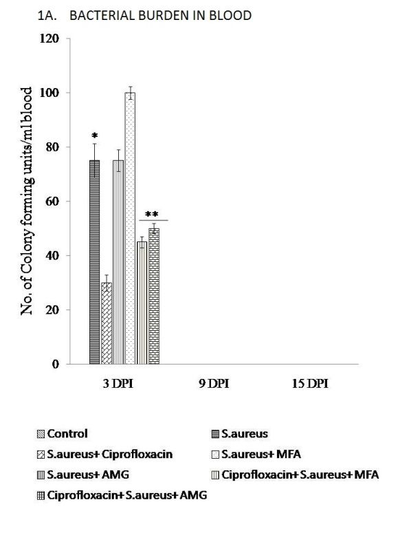 Serum creatinine level: S. aureus infected mice showed significantly higher serum creatinine level of than the control group after infection at 3, 9 as well as 15 DPI. However, treatment of mice with ciprofloxacin or AMG or MFA alone after infection, significantly reduced the serum creatinine level and was further reduced by the combination treatment of ciprofloxacin with either AMG or MFA after infection than S. aureus alone infected mice (P<0.05) (fig. 2B).