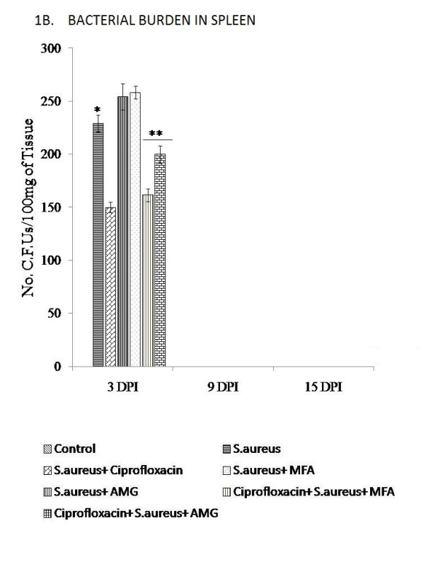 Effect of co-treatment with ciprofloxacin, AMG or MFA on viable bacteria number in the blood, spleen and synovial tissue of infected mice at different DPI: It has been observed after counting the colony from the mannitol salt agar plate that the CFU/ml of blood (fig. 1A) and CFU/100 mg of spleen (fig. 1B) in the bacteria challenged mice were highest at 3 DPI and the CFU/100 mg of synovial tissue (fig. 1C) was highest at 9 DPI for pathogenic S. aureus and then cleared from blood and spleen at day 9 and 15 whereas from synovial tissue at day 15. When AMG or MFA alone was given after 2h of bacterial infection, bacterial burden was increased in blood and tissues on 3 DPI compared to the non-treated S. aureus infected mice. Treatment with ciprofloxacin alone or in combination with either AMG or MFA after infection showed significant reduction in the CFU count in blood and spleen at 3 DPI while in synovial tissue at 3 and 9 DPI as compared to the infected group (P<0.05).