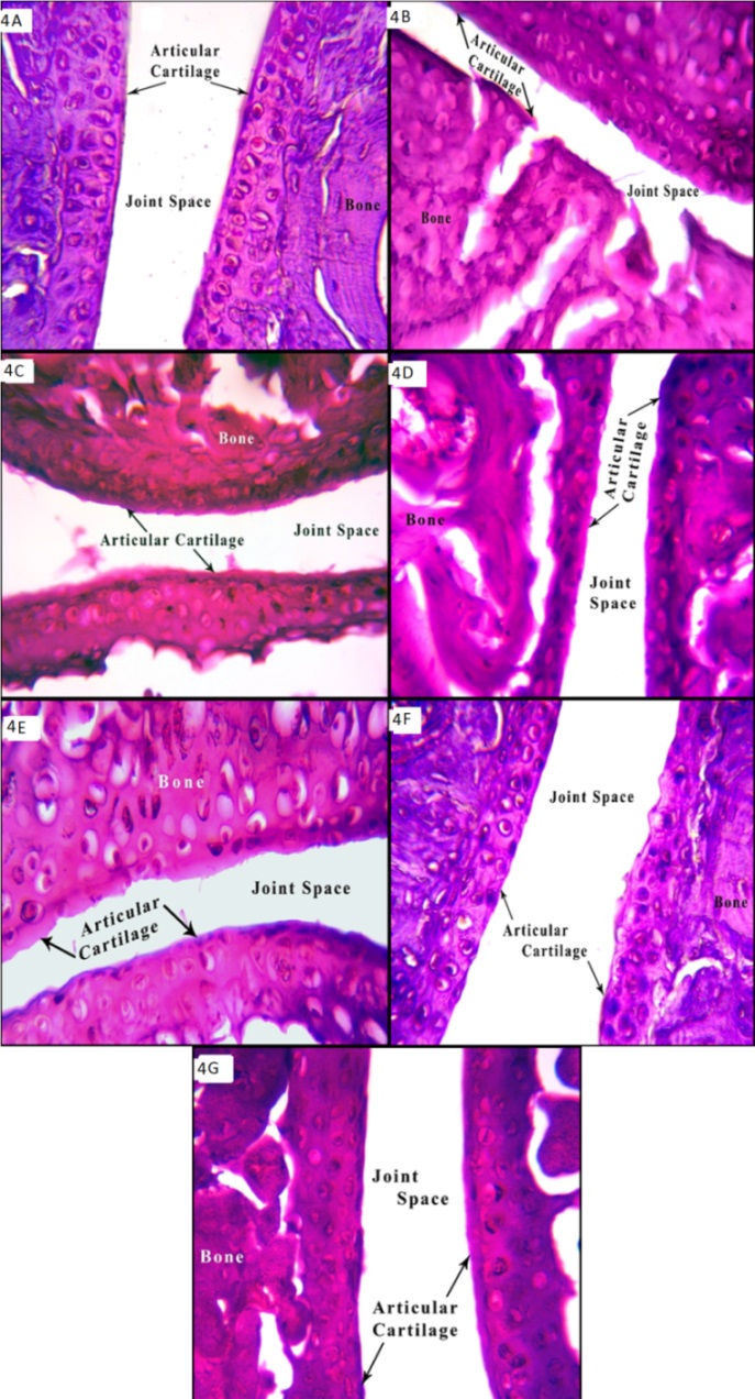 Fig. 4: Photomicrographs of paraffin-embedded H&E-stained mice knee-joint sections (400X) of control mice (A), treated with S. aureus (B),S. aureus and ciprofloxacin(C), S. aureus and AMG(D), S. aureus and MFA(E), S. aureus, ciprofloxacin and AMG(F), S. aureus, ciprofloxacin and MFA (G) respectively