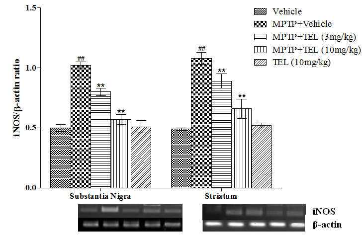 SNpc and ST regions of MPTP mice brain showed a significant up-regulation of iNOS expression [F (4,10) = 112.2, p<0.01 and F (4,10) = 73.47, p<0.01, respectively] when compared to the vehicle treated mice. TEL (3 and 10 mg/kg) significantly ameliorated these changes (p<0.01) in both the regions (fig. 1).