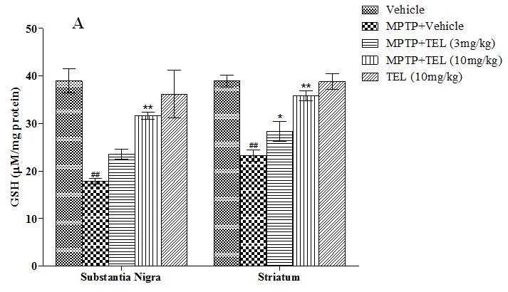 Methods: Young healthy male C57BL/6J mice were injected intraperitoneally with MPTP at 80 mg/kg in two divided doses (2 x 40 mg/kg at 16h interval). TEL was administered one hour prior to first MPTP intoxication and thereafter once in two consecutive days. The animals were sacrificed 48 h after first MPTP injection and brains were collected for further analysis.