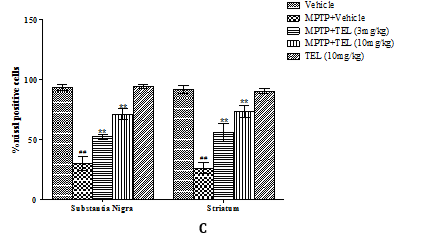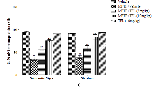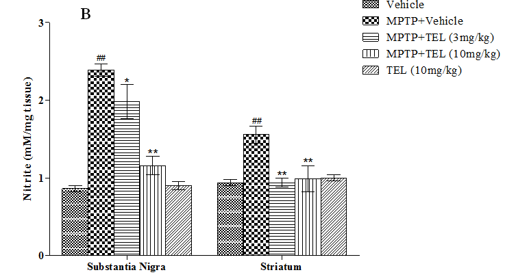 Results: TEL administration increased GSH content and decreased iNOS expression and NO level in MPTP intoxicated mice brains. Histopathological evaluation revealed that TEL decreased the cytoplasmic vacuolation and nuclear pigmentation in striatal and substantial nigral regions of MPTP intoxicated mice brain. The neuroprotective effect of TEL was further evidenced with increased neuronal nuclei (NeuN) immune fluorescence in MPTP mice brains.