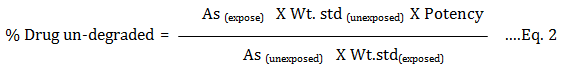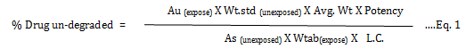 Where, Au-area of unknown, As (expose)-area of exposed standard, As (unexposed)-area of unexposed standard, Wt. std (unexposed)-weight of standard taken, Wt. std (exposed)-weight of exposed standard taken, Wtab-weight of tablet powder taken, L. C.-label claim of drug