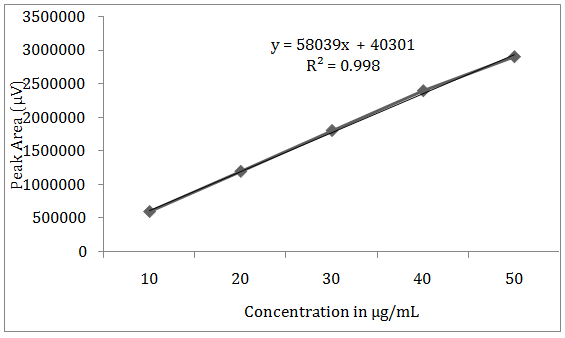 Calibration curve plot (fig. 4) of an area under curve against concentration shows that FLV was found to be linear over the range of 10-50 μg/ml with correlation coefficient 0.998.