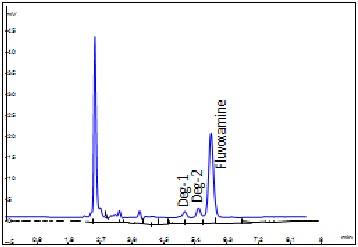 Literature survey reveals that RP-HPLC [2-5] methods are reported for the estimation of Fluvoxamine in plasma as the single dosage form or in combination with other drugs. Also some RP-HPLC [6-8] methods reported for analysis of said drug in tablets. A detailed literature also indicates UV-Spectophotometric [9], Polarographic [10], HPTLC [11] and Capillary GC [12] methods are reported for estimation of Fluvoxamine. An attempt was made to develop and validate totally new, precise, accurate, economic, isocratic RP-HPLC method for the quantitative estimation of Fluvoxamine in presence of its degradation products as per ICH guidelines. This manuscript gives the report for the application of specific stability indicating with degradation kinetics and RP-HPLC method in estimation of drug from its pharmaceutical dosage form.