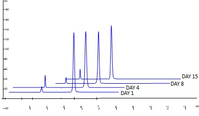 For intra-day, sample solution (20µg/ml) was prepared as per the procedure described under marketed formulation and analyzed at intervals of 0thh, 2h, 6h and 8h and same solution analyzed at intervals of 1st, 3rd and 5thday.