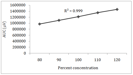 Accurately weighed quantities of tablet powder equivalent to 80, 90, 100, 110 and 120 % of label claim were taken separately and dilutions were made as described under marketed formulation. After equilibration of the column with mobile phase 20 µl volume of the final diluted solutions were injected in the system separately and chromatograms were recorded. Linearity curve was constructed by plotting the concentration level of drug verses corresponding peak area.