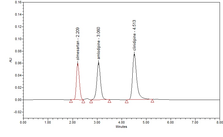 Results: The retention time of olmesartan medoxomil, amlodipine besylate and cilnidipine were 2.2, 3 and 4.5 minutes respectively. Linearity of the method was found to be in the concentration range of 10-100µg/ml for olmesartan medoxomil, 5-50µg/ml for amlodipine and 10-100µg/ml for cilnidipine. The correlation coefficient value was greater than 0.999 for all the analytes.