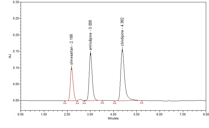 The main focus was to achieve sharp and Gaussian shaped peak with tailing less than 1.5 and resolution greater than 1.5. In order to achieve this goal acetonitrile, methanol, water in different proportion were used but no sharp peaks were observed. Ammonium acetate was then added to increase the polarity of mobile phase. A 0.05M concentrations of ammonium acetate at pH 7.3 with acetonitrile and methanol in the ratio of 30:50:20 v/v was strong enough to elute the three components with resolution greater than 5, theoretical plate greater than 3500 and tailing less than 1.5 for the three components. The best mobile phase composition was then found to be 0.05M ammonium acetate pH 7.3, acetonitrile and methanol in the ratio of 30:50:20 (v/v) Under mentioned chromatographic condition sharp peaks belonging to olmesartan medoxomil, amlodipine besylate and cilnidipine were obtained at retention time of 2.2, 3 and 4.5 minutes respectively (fig. 1 and 2).