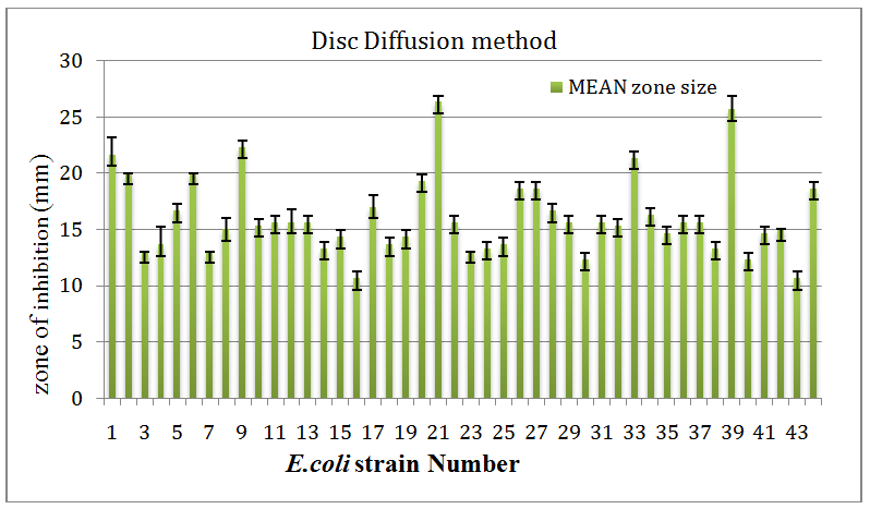 Fig. 1: Bar chart showing mean zone sizes of AGTE by disc diffusion method. Vertical bars indicate standard deviation (n=3)