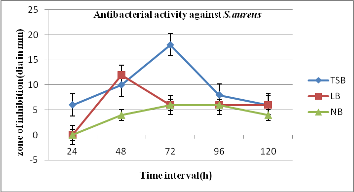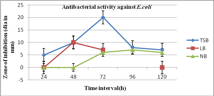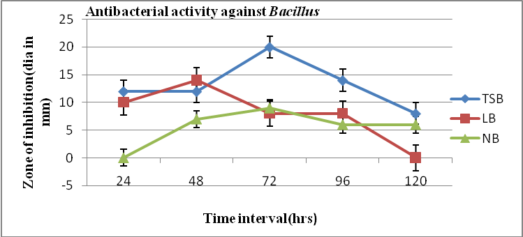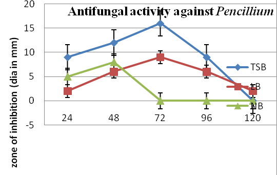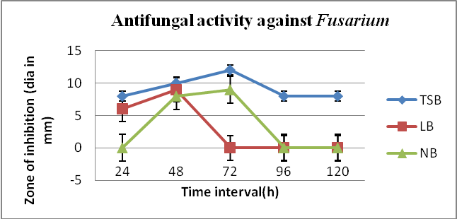 When the bacterial fermentation was standardized in three different media namely TSB, LB and NB for different time intervals starting from 24 h to 120 h, the maximum antibacterial activity was recorded in TSBmedium at 72 h. This was followed by LB at 48h and very less activity was recorded in the case of NB (fig. 1. a-c). The antifungal activity was also shown to be the maximum in the case of TSB media at 72 h of fermentation (fig. 2. a-c).