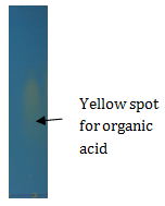 This was again subjected to preparative TLC to remove the impurities. The 75% to 100% DCM fraction eluted from the column showed significant antibacterial activity against B. subtilis and S. aureus and antifungal activity against A. flavus, C. albicans, F. oxysporum andR. solani (table 1). This fraction gave positive result for the test for organic acid by dipping the chromatogram in a solution of 5 mg Bromo cresol green in 25 ml ethanol and 0.25 ml of 0.1M NaOH. A yellow spot was obtained on a blue background (fig.3).