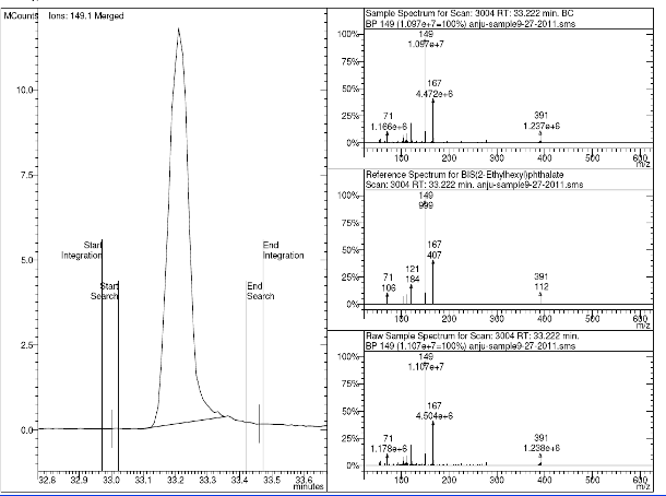 Partial purification by column chromatography followed by GC-MS and LC MS studies led to the identification of Bis (2 ethyl hexyl) phthalate (fig. 5) as a major antimicrobial compound.