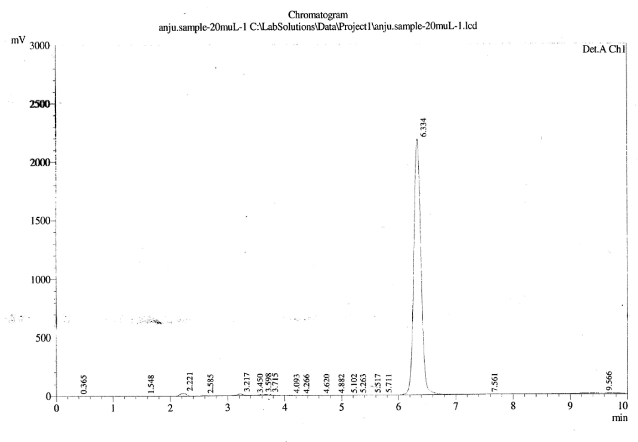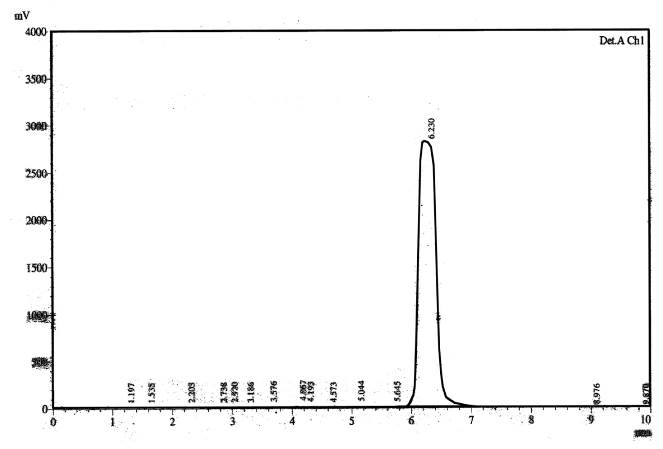 HPLC analysis of the purified compound showed that it eluted at a retention time of 6.3 which was comparable with that of standard (Retention time 6.23) confirming the identity of the molecule (fig. 6 and 7).