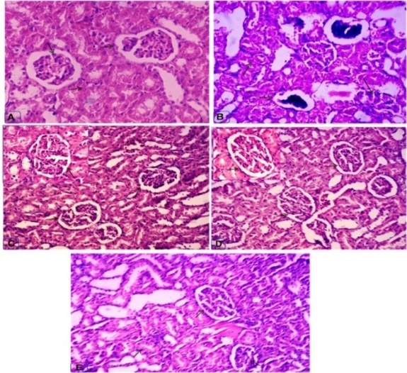 Fig. 2 is a photomicrograph of kidney sections (H&E) stain. 6A section showed normal hepatic cells of healthy control rats. 2B section of ALX group (150 mg/kg, i. p) showed increases in the severity of mineralization and interstitial fibrosis of the kidney cells, major lesions were observed in the cortex x 200. 2C section of ALX group treated with STB extract, minor renal tubular damages are seen. 2D section of ALX group treated with STA extract revealed enhancement in glomeruli and tubule, glomerulus showing normal cellularity despite some tubular dilatation. 2E section of ALX group treated with glibenclamide as standard drug showed enhancement in most cells of the kidney.