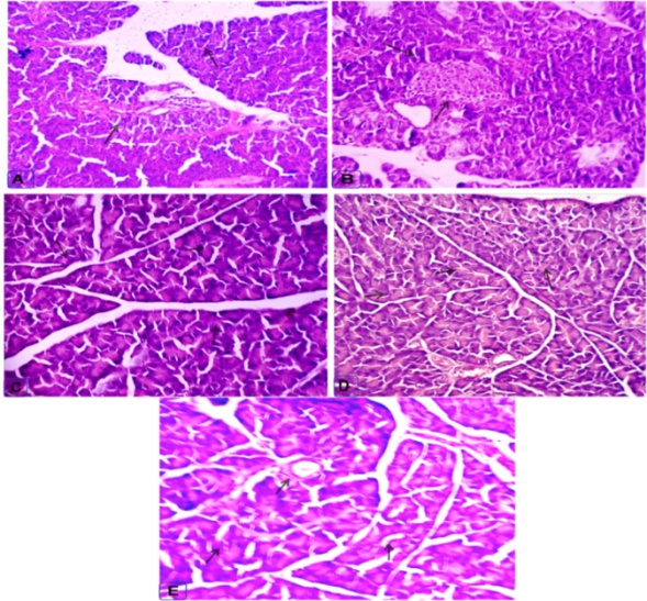 Fig. 3 is a photomicrograph of pancreas sections. 3A section of pancreatic tissue of normal control arrayed showed normal distribution of islet of Langerhans within the exocrine part, is lets were regular with well-defined boundaries. 3B section of ALX-diabetic showed shrinkage of islets Langerhans in size, completely destroyed islets leaving empty spaces. 3C, 3D are pancreatic sections from diabetic rats after treatment with STB and STA extracts revealed that pancreatic islets were parallel to a normal pancreas. 3E section of ALX group treated with glibenclamide as drug showed the islets of Langerhans with well-organized, granulated cells.