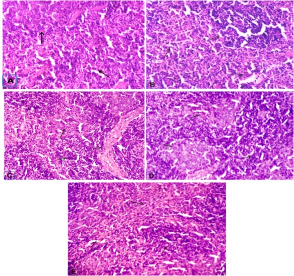 Fig. 4: Spleen sections (H&E) stain. A section showing the normal cells of healthy control rats x 200. B Section of ALX group (150 mg/kg, i. p). C section of ALX group treated with STB cultivar. D section of ALX group treated with STA cultivar. E section of ALX group treated with glibenclamide as drug