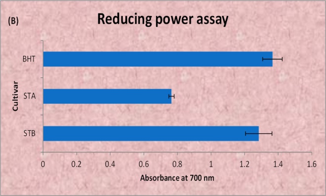 Results in fig. 5A indicated that at a concentration of 1 mg/ml, DPPH scavenging activity of the ethanol aerial parts extract of the STB cultivar of S. tuberosum reached to 59.82 % and 29.09 % for STA, this may be attributed to the differences in the total polyphenol and flavonoid contents, while at the same concentration DPPH radical scavenging activity of BHT recorded 90.97 %. The reducing power assay is used to test the reducing capability of two cultivars S. tuberosum L aerial parts extract to reduce the ferric (Fe3+) complex to their ferrous form (Fe2+). The reducing power of the extracts was determined through their absorbance at 700 nm. Increased absorbance of their reaction mixture indicated increased reducing power. As shown in fig. 5B, each cultivar extract showed good reducing power. The STB cultivar, however contains overall higher reducing activity (1.28) which was as near as to the standard compound BHT (1.36) compared to the STA cultivar (0.764) at concentration 1 mg/ml. The differences in the reducing power might be contributed by the phenolic compounds content in the two cultivars
