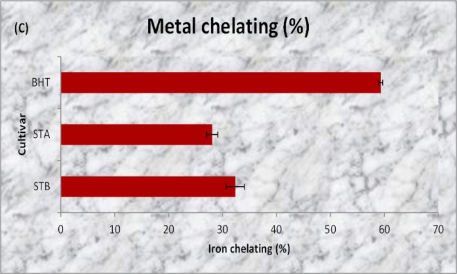 Metal chelating activity (fig. 5C) was 32.35 % and 28.04 % for STB and STA cultivar, respectively. STB, STA cultivars of S. tuberosum L. aerial parts extract were fast and effective scavengers of the ABTS radical (fig. 5D) and this activity were comparable to that of BHT. At 1 mg/ml, the percentage inhibition was 79.43, 74.71 and 85.43 % for STB, STA cultivar of S. tuberosum L., and BHT, respectively. FRAP activity of STB and STA extracts is given in fig. 5E as µmol Trolox/100 g D. W. The values obtained by FRAP assay were 2271 and 1828 μmol Trolox/100 g D. W. for STB and STA cultivar, respectively.