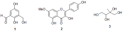 Three compounds 1-3 were obtained. These known compounds, previously not isolated from Solanum genus, were 2,5-dihydroxy-3-hydroxymethyl-benzaldehyde 1, rhamnocitrin (3,4',5-trihydroxy-7-methoxy flavone) 2 and 2-methyl erythritol 3 [52, 53]. The isolated compounds were identified by UV, MS,1H and 13C analyses. The analytical data were in agreement with those reported in the literature.
