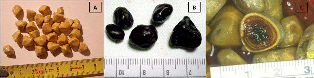 Fig. 1: (A) Cholesterol, (B) pigmented (Source: www. med. umich. edu) and (C) mixed stones (Source: health-fts.blogspot.com)