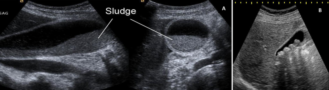 Fig. 2: (A) Biliary sludge (Source: http://www.radiologytutorials.com), (B) Multiple gallstones (Source: http://www.rcstn.net/marisa.bush)
